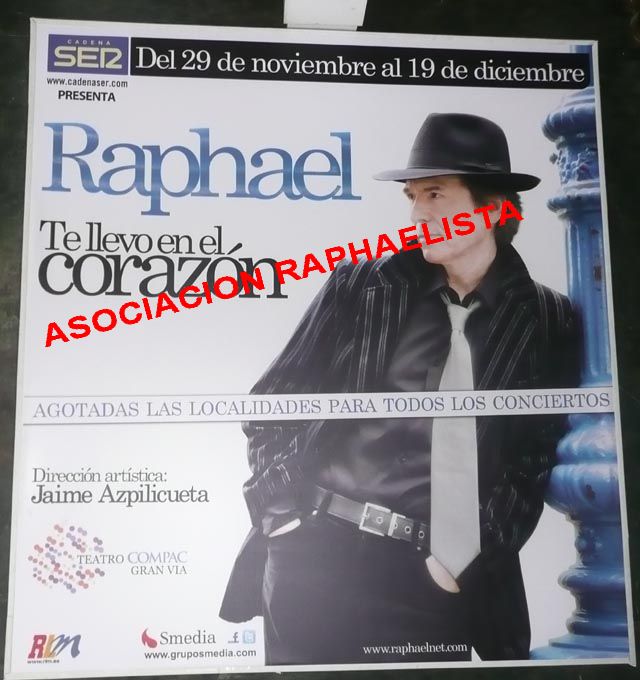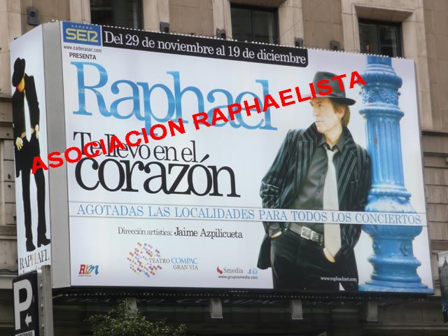 YA ESTOY EN MADRID, Y NO VEIAS QUE GUSTAZO DE LLEGADA A LA CAPITAL, CUANDO AL PASAR POR LA GRAN VIA EN LA FACHADA PRINCIPAL DEL COMPAC, VEO UN ENORME CARTEL DE RAPHAEL CON EL ANUNCIO DE LOS CONCIERTOS Y UN LETRERO ENORME QUE PONE..... "LOCALIDADES AGOTADAS PARA TODOS LOS DIAS"