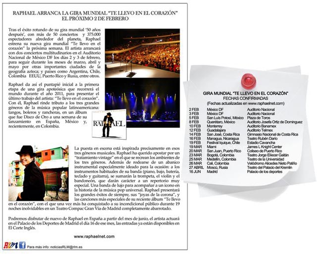 Poco a poco la gira va tomando forma, y va configurandose paises que disfrutaran del concierto de RAPHAEL.