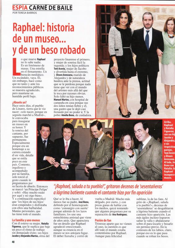 Isabel, con tu permiso, pongo el art?culo de dicha revista escaneado por aqu?. Por cierto, odio que en muchos peri?dicos y revistas justo hayan pillado en la mitad de las dos p?ginas a Raphael porque es imposible escanearlo as?!!!! Pero bueno, el art?culo es este: