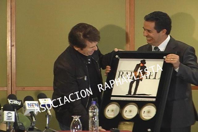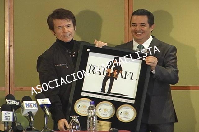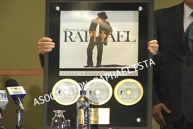RAPHAEL recibe en Colombia un disco de oro por la gran acogida que ha tenido su nuevo trabajo musical "Te llevo en el coraz?n" Complacido con la sorpresa RAPHAEL recibe el reconocimiento de Sony. Aqui les mando imagenes del emotivo momento. Un abrazo Pilar Generacion R Canal CALITV Cali, Colombia