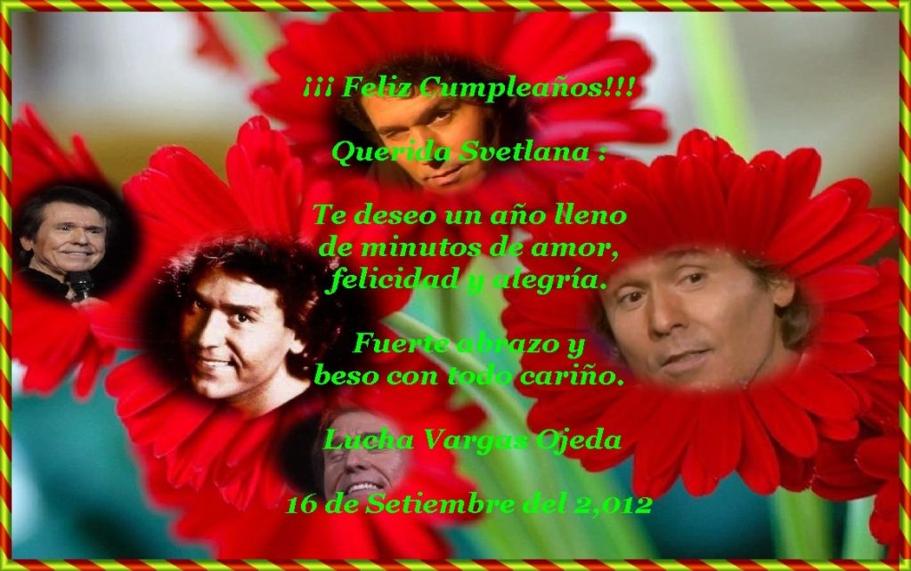 ???Muchas phelicidades Svetlana!! Que tengas un dia de cumplea?os estupendo, rodeada de cari?o y de muchos regalos. Que la buena m?sica te acompa?e en este dia de cumplea?os.