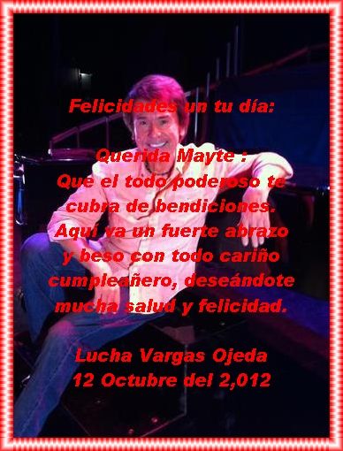 Muchas phelicidades Mayte!!! Espero que pases un dia en familia lleno de cari?o y de buena compa?ia.......... Que te colmen de regalos y que la buena m?sica no deje nunca de sonar.