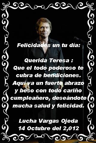 ??Muchas phelicidades Teresa!!! Que cumplas muchos m?s y que estos 23 te sienten de cine!!! Disfrutalos en buena compa?ia y con la mejor de las bandas sonoras: Raphael.