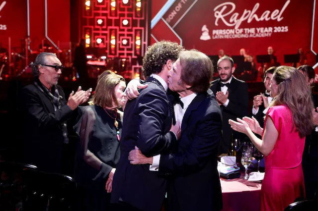 Los Grammy Latinos —que en la noche del jueves celebrarán su entrega de premios anual— escogieron a Raphael como Persona del Año por ser “una gran leyenda de la música latina”. “Su trayectoria musical es muestra de su compromiso”, aseguró Manuel Abud, el CEO de la Academia Latina de Grabación. Ya le avisó: “Te la vas a pasar muy bien”. Y así fue, aunque ese orgullo y ese viaje lo reflejara con lágrimas en los ojos, completamente emocionado, actuación tras actuación. Artistas de todas las generaciones le honraron con sus temas y versiones, demostrando cómo Raphael ha sabido conectar con todo tipo de públicos y países, donde se le rinde pleitesía. “Señoras y señores, mi nombre es Raphael Martos Martínez”, arrancó un jovencísimo Raphael en un vídeo de homenaje en el que contaba cómo siempre le echaban de la escuela, pero también que el responsable del coro le rescataba una y otra vez. Mientras, el rostro del artista se veía en la pantalla, que le mostró en grande toda la noche, reaccionando a vídeos, mensajes y actuaciones. Sus ojos, vidriosos y temblorosos, mostraban su emoción, mientras recordaban sus 350 discos de oro y el de uranio (fue el primer artista en recibirlo), sus películas o sus actuaciones en los años sesenta en los programas de Estados Unidos. Todo ello sin olvidar que los días que nacieron sus hijos fueron “los días más felices” de su vida, junto al del matrimonio con su esposa, Natalia Figueroa; todos ellos estuvieron presentes en Las Vegas. Manuel Abud, CEO de la Academia Latina de Grabación, y el músico Enrique Bunbury entregan a Raphael su premio como Persona del Año, el 12 de noviembre de 2025 en Las Vegas. Y tras ello, las actuaciones. Empezó Enrique Bunbury, vestido con un traje verde oliva, cantando Yo Soy Aquel, acompañado en el escenario por una orquesta de cuerda. Poco después se le unió el mexicano Carín León para interpretar Ahora, uno de sus éxitos de los ochenta. Después, el actual rey del regional mexicano, que ya lleva un gran historial en Las Vegas y lo aumentara en 2026 cantando en la Esfera, siguió con una hermosa versión de Toco madera. Después subieron al escenario los Café Quijano para cantar Qué tal te va sin mí junto a la cantautora guatemalteca Gaby Moreno. Dieron el relevo a Elena Rose y David Bisbal, vestidos de lentejuelas, que se unieron para hacer una melódica pero potente versión de En carne viva. Después, el almeriense volvió con Como yo te amo, uno de los grandes clásicos del artista que levantó aplausos. Suyo fue uno de los grandes momentos de la noche, bajando hasta la mesa del cantante y su familia para sentarse con ellos, servirse una copa de vino y cantar, mirándole a los ojos, cada estrofa de su mítica canción. David Bisbal se sienta en la mesa ante Raphael, su esposa y sus amigos y familiares durante la entrega del reconocimiento como Persona del Año, el 12 de noviembre de 2025 en Las Vegas. Bisbal quiso tener unas cariñosas y sinceras palabras con un hombre al que muchas veces ha considerado un mentor y un ejemplo. “La verdad, Raphaelico —Rocío Jurado te llama Rapi, y yo, Raphaelico— no sé qué decirte porque te lo he dicho todo. Hace ya mas de 25 años que somos amigos. Muchísimas gracias por haber dejado un legado de disciplina de esfuerzo, de sacrificio, de ausencia. Porque muchas veces está detrás la ausencia de tu familia, de Natalia“, afirmaba, emocionando a Figueroa. “Si ese es el legado que has dejado a los artistas, puedes contar conmigo porque voy a seguir llevando tu palabra siempre”, afirmó, emocionado. “Jamás habrá algo parecido. Te quiero mucho, desde el fondo de mi corazón”. Tras él llegaron Iván Cornejo, otra de las estrellas del regional mexicano, que cantó Cierro mis ojos junto a sus compatriotas Jesse y Joy.